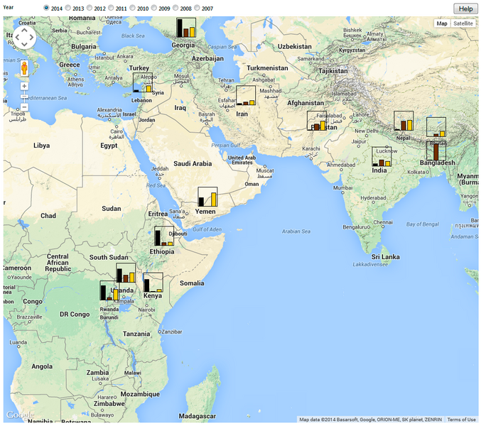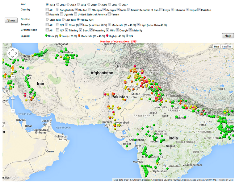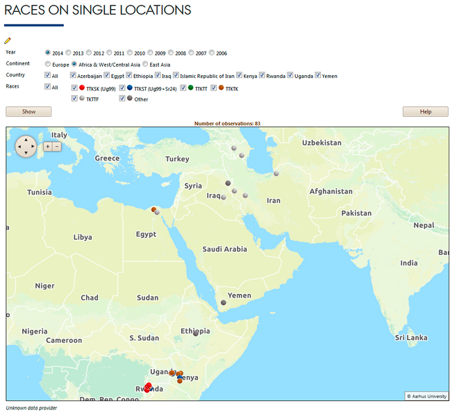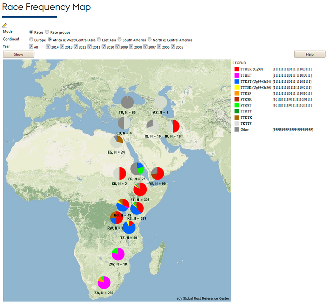 Below is link to different tools that analyse and display information about the historical and current distribution and importance of stem rust, leaf rust and yellow rust - mainly in Africa/Central and West Asia. Use the link below the Screen dumps or select from the menu to the left.